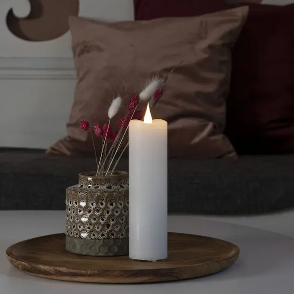 Vokslys i hvid farve med varmt hvidt LED-lys. Drevet af 2xAA-batterier (medfølger ikke) Timerfunktion i 4 eller 8 timer.