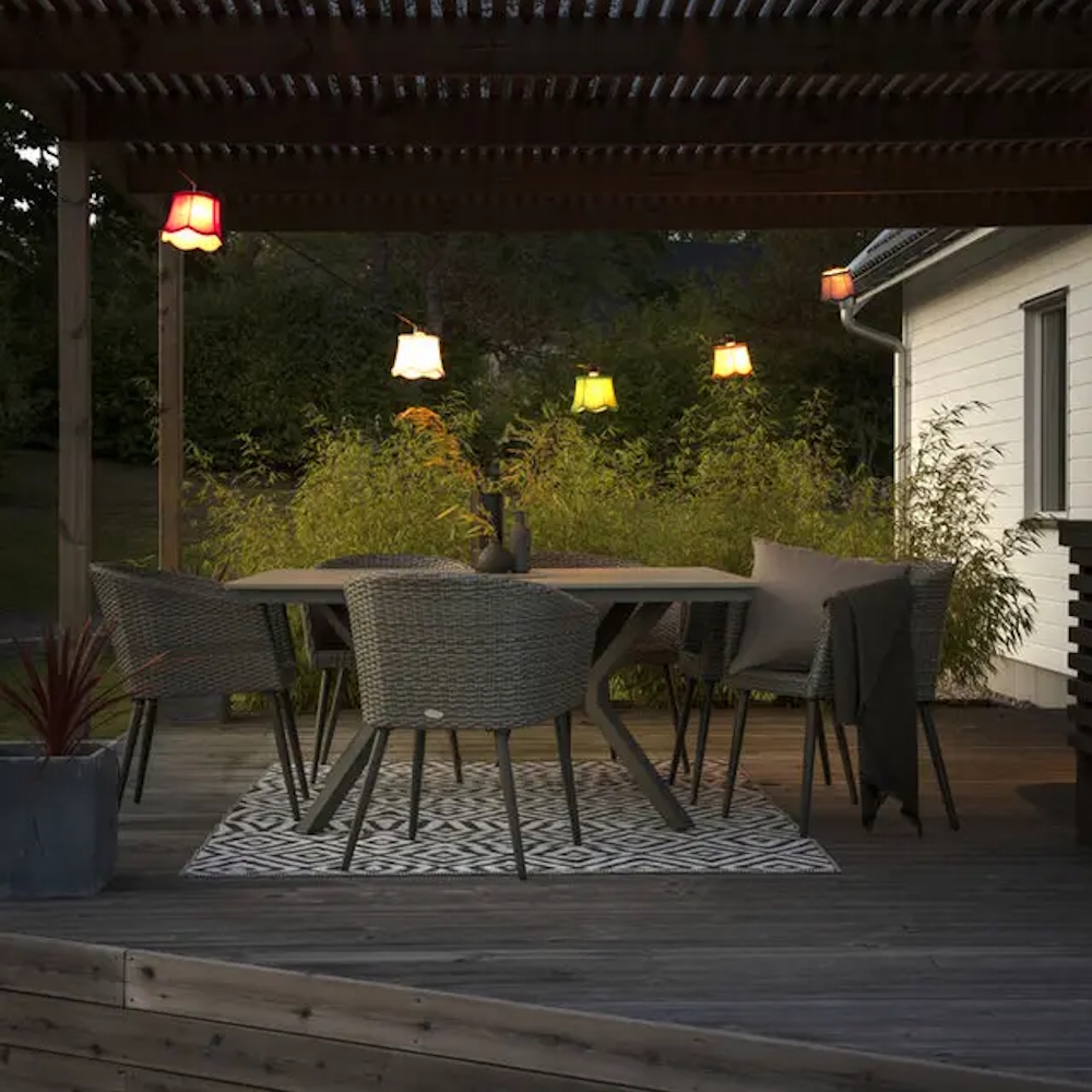Additional string with 10 amber-coloured LED lamps with colourful and playful lampshades spreads a cosy glow. [Energiklass G]