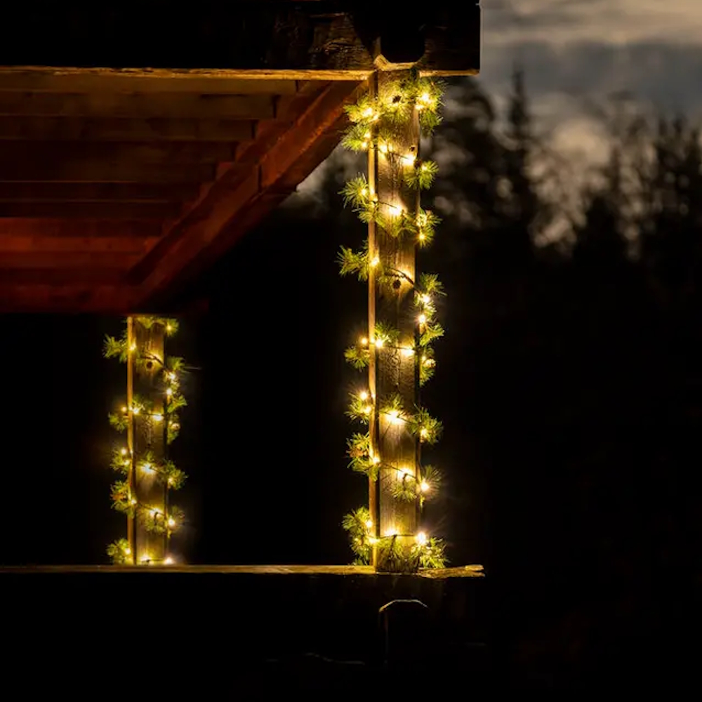 This beautiful garland with artificial small cones and pine needles gives a warm, atmospheric glow with its 60 warm white LED lights. It is perfect for creating a magical winter atmosphere both indoors and outdoors. With its natural design, practical battery operation and 6-hour timer, the string of lights is an elegant and easy-to-place detail that elevates your winter and Christmas decorations.