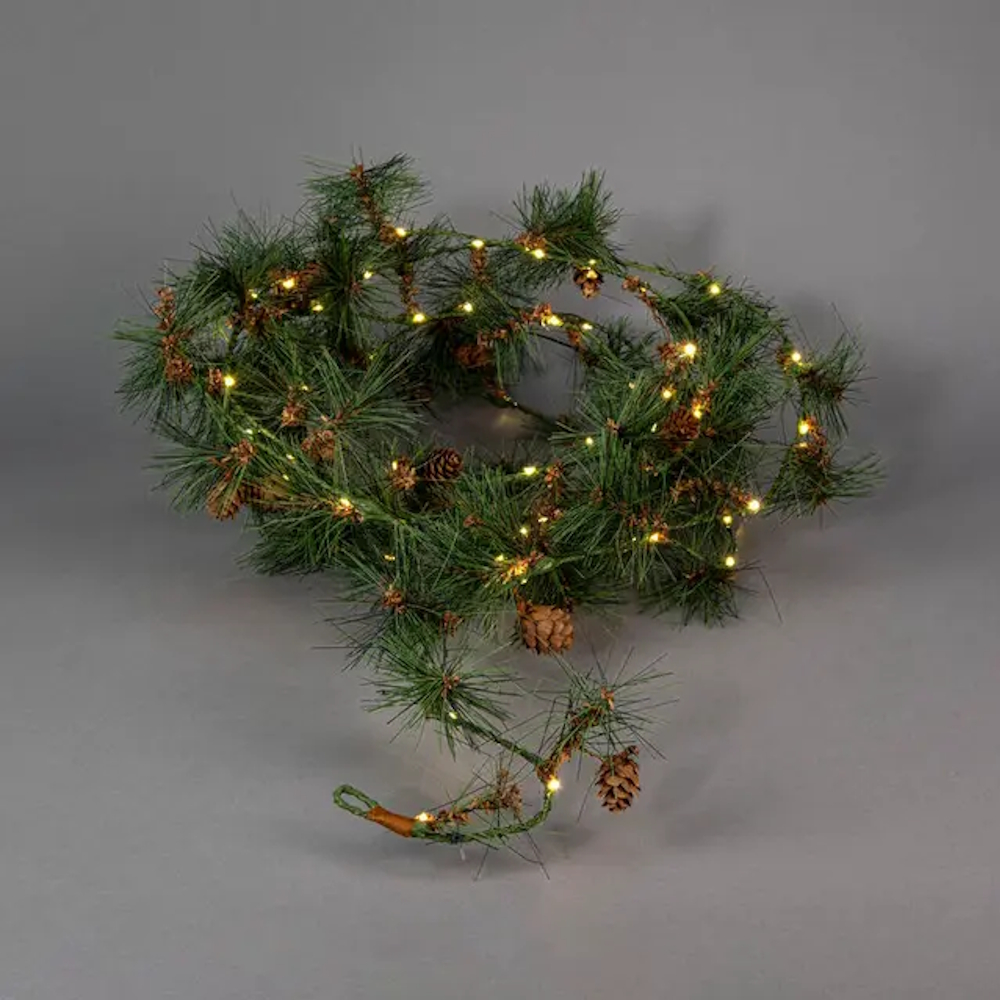 This beautiful garland with artificial small cones and pine needles gives a warm, atmospheric glow with its 60 warm white LED lights.