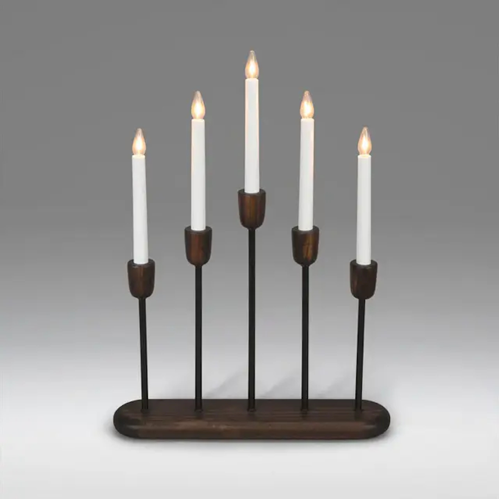 Elegant 5-armed Advent candlestick with warm white LEDs. Black metal/walnut color. Connection cord of 1.7 meters.