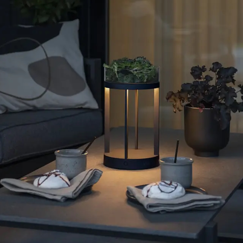 The Chieti USB lantern is a stylish table lantern with an open design and glass decoration. It is charged via USB and is dimmable (2700K/3000K).