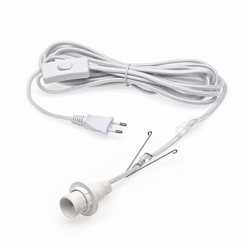 A cord rack with a white textile cord of 5 meters, equipped with an E14 socket and built-in switch. The product is intended for indoor use and is IP20-rated. The cord is fabric covered and the color is white. The socket fits any light source (not included).