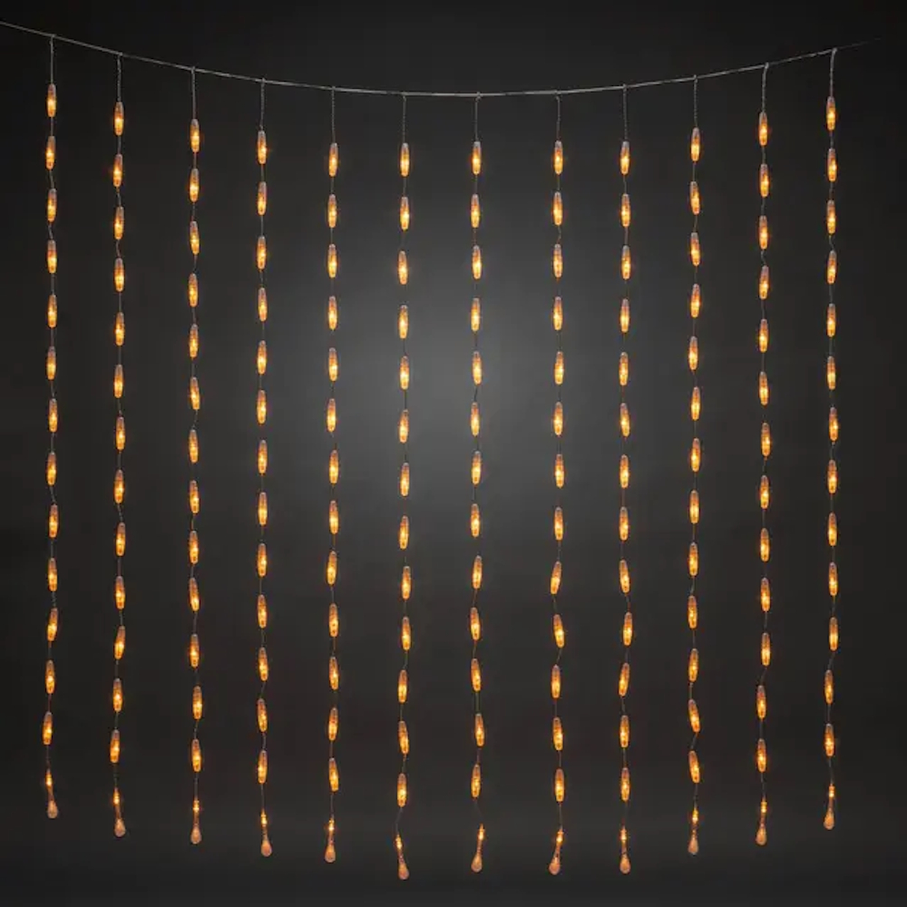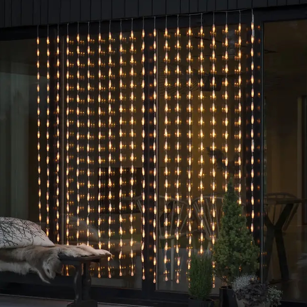 This outdoor light curtain is adorned with 400 amber-colored LEDs in a drop shape, it spreads a welcoming glow. [Energiklass F]