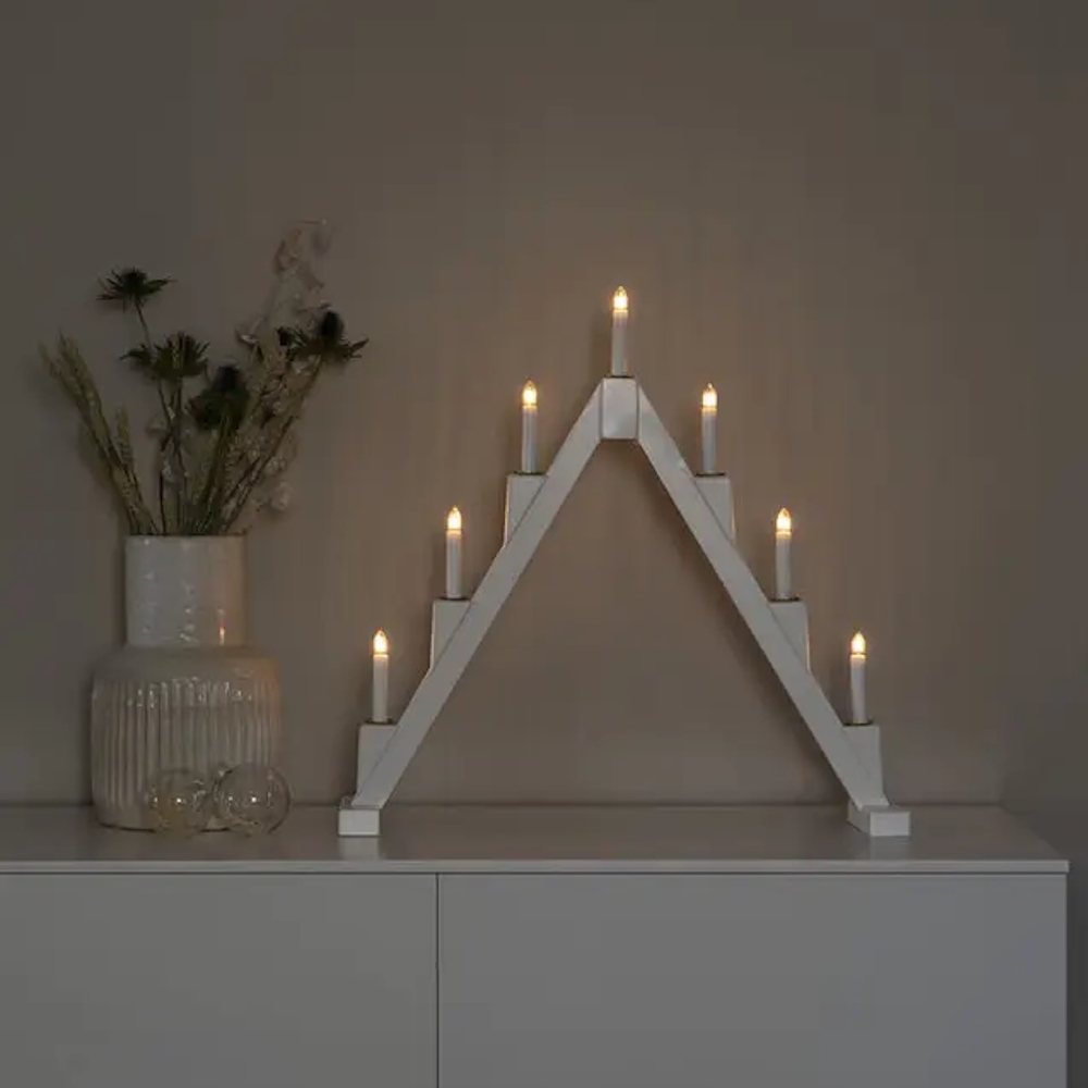 Classic Advent candlestick in lacquered wood with elegant brass-colored metal candle sleeves - a timeless favorite that spreads atmosphere in the winter darkness. With 7 warm white candles and smart foldable design, it is both beautiful in the window and easy to store until next Christmas.