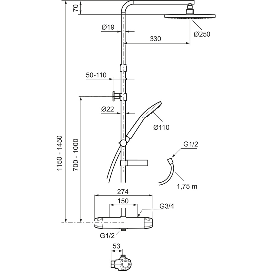 - Väggfäste fritt justerbart i höjdled, 700–1000 mm från anslutning och 50–110 mm utsprång från vägg, 2x20 mm distanser medföljer, med väggtätning, dold rörskarv