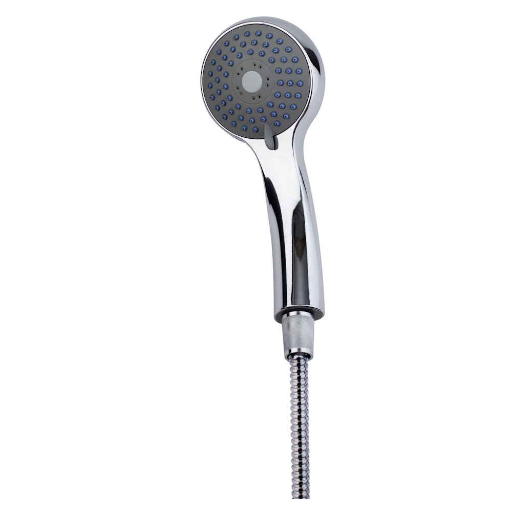Chrome adjustable hand shower in blister packaging with anti-limescale function with three different jet types.