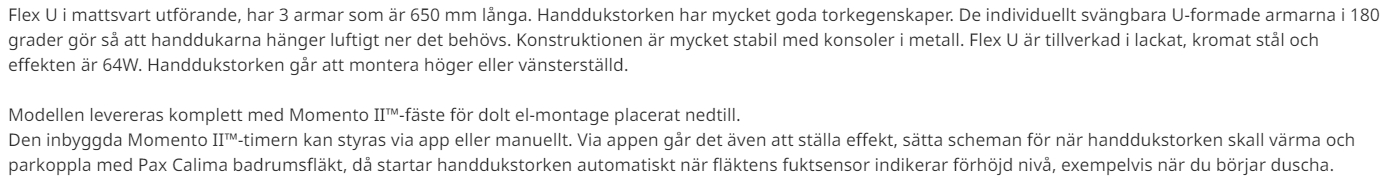 Elektrisk handdukstork i svart med intelligent repetetiv Momento II-timer. Smart separat kopplingshus för enkel elanslutning/dockning av handdukstorken. Endast 64W och med lackade svarta zinkfästen. För dold elanslutning, allpolig brytare/IP44/230V 50Hz/Dubbelisolerad/S/CE, kan kommunicera tillsammans med Calima fläkt.