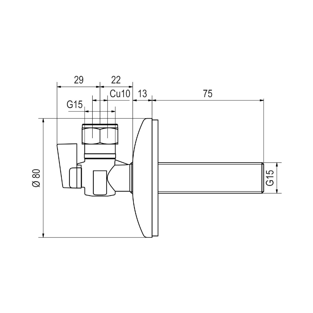For all LK Wall Boxes. Supplied with chrome-plated wall washer diameter 80 mm. External G15 for connection to the wall box's angled nipple, 75mm long. At the angle, a compression ring coupling with shut-off for connection of 10 mm copper pipe. If the nut for the compression ring coupling is removed, there is an external G15 thread for connection of e.g. half coupling or connection hose with floating nut and flat gasket.