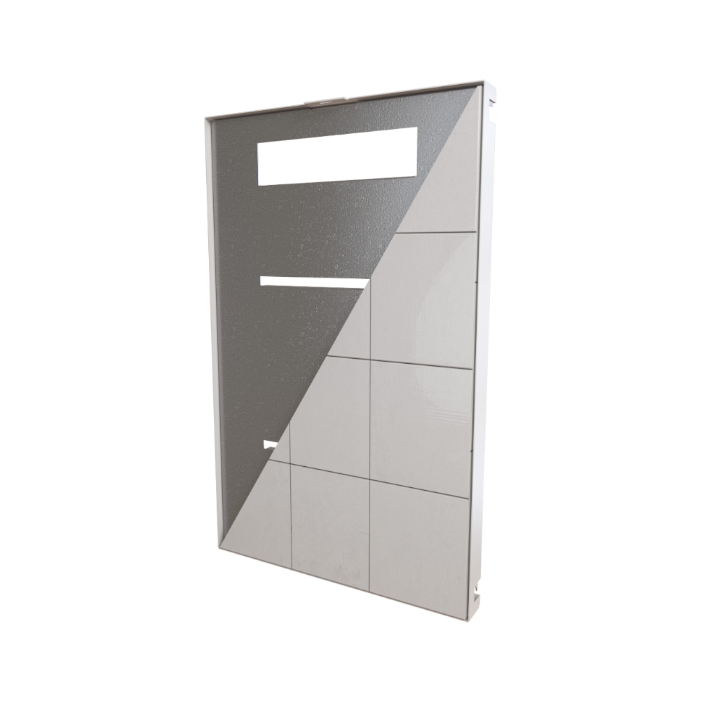 Door intended for LK Wet Zone Door Preseal. To get a stylish design it is possible to glue tiles on the door. The inner tile frame can be adjusted between 6-13mm so that the surface of the finished tiled door is flush with the wall. The door closes with a magnet against the tight door and has a discreet handle on the top edge for opening. The door is not intended for daily watering. Made of powder-coated galvanized steel sheet, white color RAL9016.