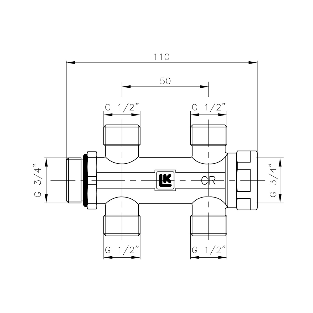 Surface-mounted manifold for heating and tap water systems. Mounted on the wall or ceiling in LK Manifold Console or in LK Manifold Cabinet UNI. Made of dezincification-resistant brass, nickel-plated. The manifold has a G20 connection (internal and external thread EuroCone) for the supply line and a G15 c/c 50 mm external gg Conex/EuroCone connection on the branch. The manifold has an O-ring seal on the external G20 side for the supply line, which makes it easier to assemble 2 manifolds without additional sealing.