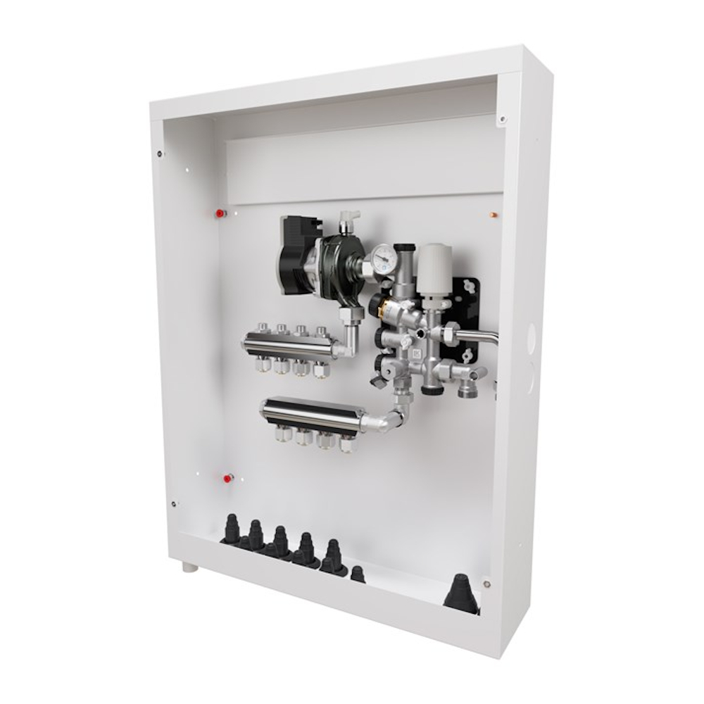 LK Minishunt Cabinet M60n Prefab, complete with mounted Minishunt M60n, Mini Distributor and couplings for 16mm underfloor heating pipes.