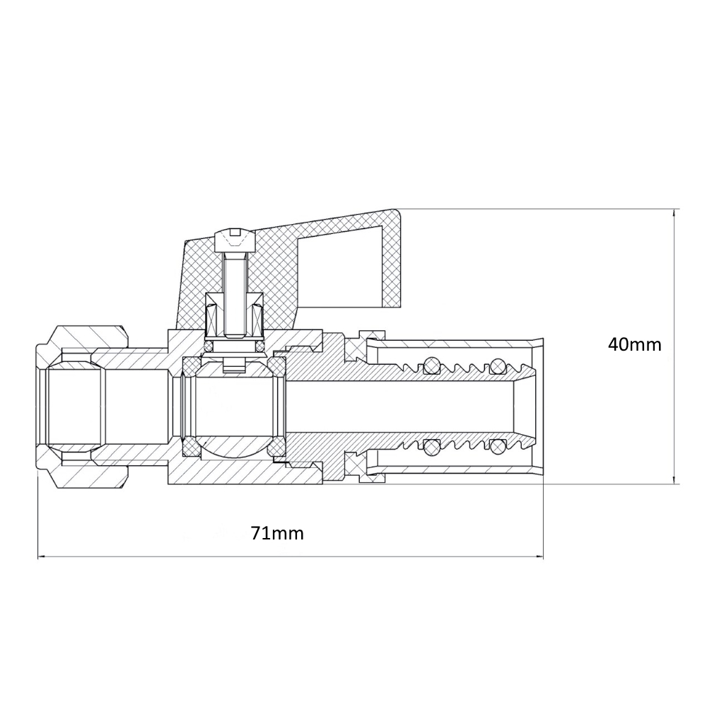 Ball valve with PressPex connection for LK PE-X and PAL Universal pipe 16mm. On the other side there is a compression ring coupling for copper pipes for example a sink mixer. If the nut is removed on AX16xCu10 to the compression ring coupling there is an external G10 thread for connecting, for example, a connection hose from a mixer with a floating nut and flat gasket. Also suitable for LK Underfloor heating pipes dimension 16x2.0mm.