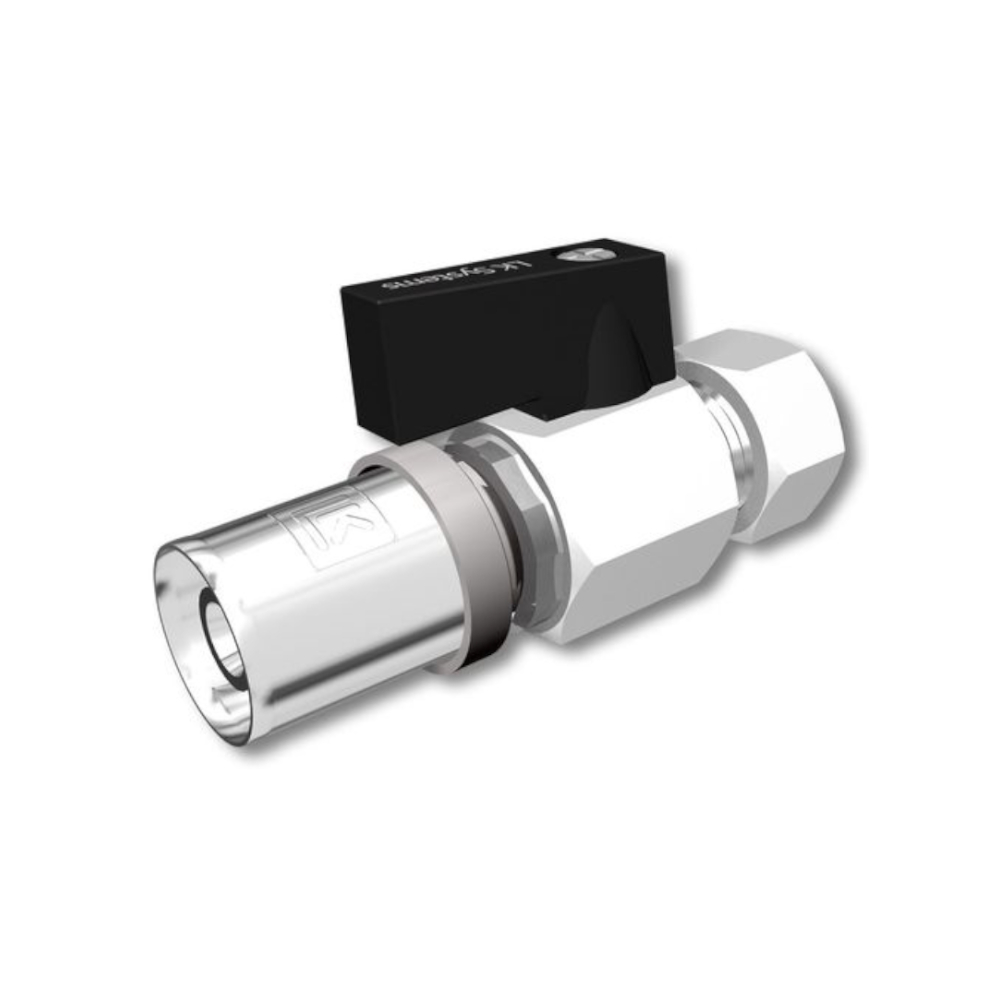 Ball valve with PressPex connection for LK PE-X and PAL Universal pipe 16mm, on the other side there is a compression ring coupling for copper pipes.