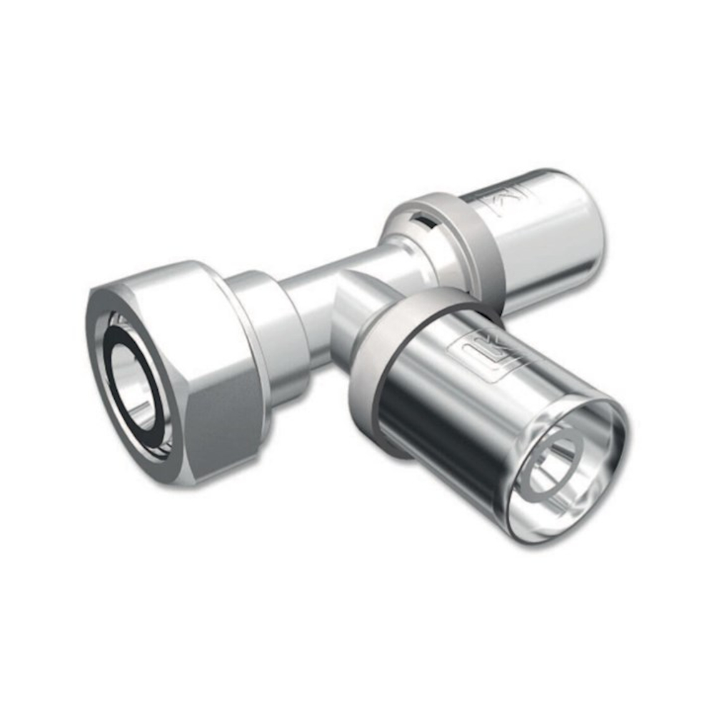 LK PressPex T-coupling with play nut for connecting LK PE-X and LK PAL Universal pipes to external EuroCone on e.g. LK Manifold UNI.