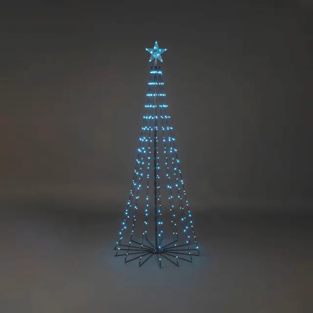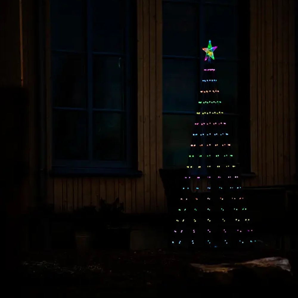 Effective Christmas tree with top star. The Christmas decoration has 15 loops with 265 RGB-colored LEDs, which can be set in different colors and functions. Black cable including 5V transformer and remote control (operated with 1 3V battery, not included).