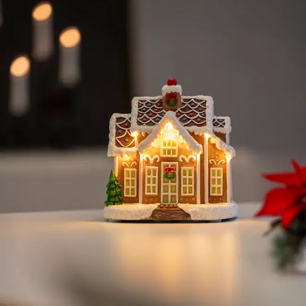 This cute gingerbread house is decorated with colorful candies and white frosting that looks freshly made just like a real pastry. The warm white LED light illuminates the house and creates a cozy Christmas atmosphere. Perfect in your Christmas village or as a table decoration. With a built-in timer function (6 hours on/18 hours off) and the option of both battery and USB operation, it is easy to spread Christmas magic - day after day.