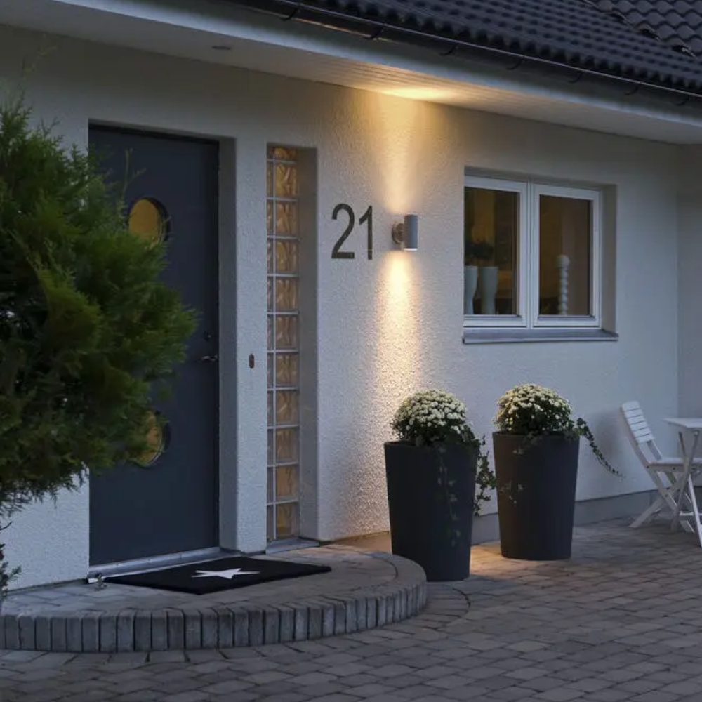 Modena facade lighting, in grey lacquered aluminium with clear glass, a stylish outdoor lamp where the light is directed upwards and downwards.