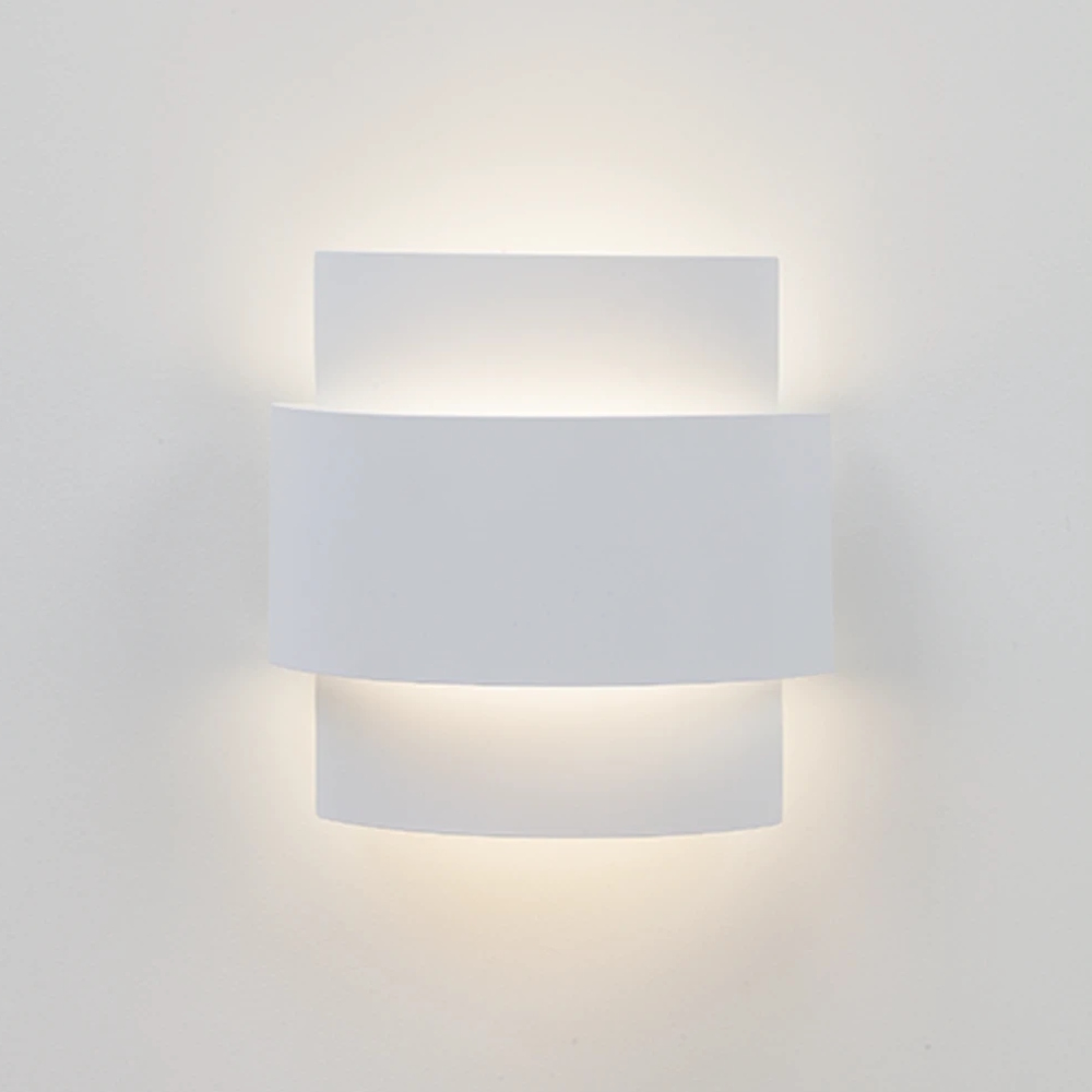 Wall lamp in matt white sheet steel, with decorative arch that emits good glare and a nice trailing light around the luminaire. Painted in matt white RAL 9016 and equipped with AC LED 9W. Connected with quick connector from the back and via the sides, knockout holes in the wall plate for surface-mounted cabling. Halogen-free cable.