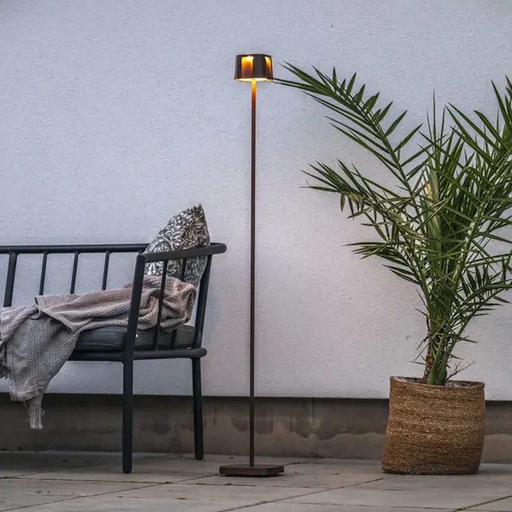 Nice is a stylish floor lamp with adjustable lighting where you can choose a color temperature between 2700K or 3000K and it is dimmable. This lounge lamp fits equally well in the living room as on the patio. Charges via USB and has a battery life of approx. 9 hours at full brightness. On/off button at the top of the screen. Rust-colored painted aluminum.