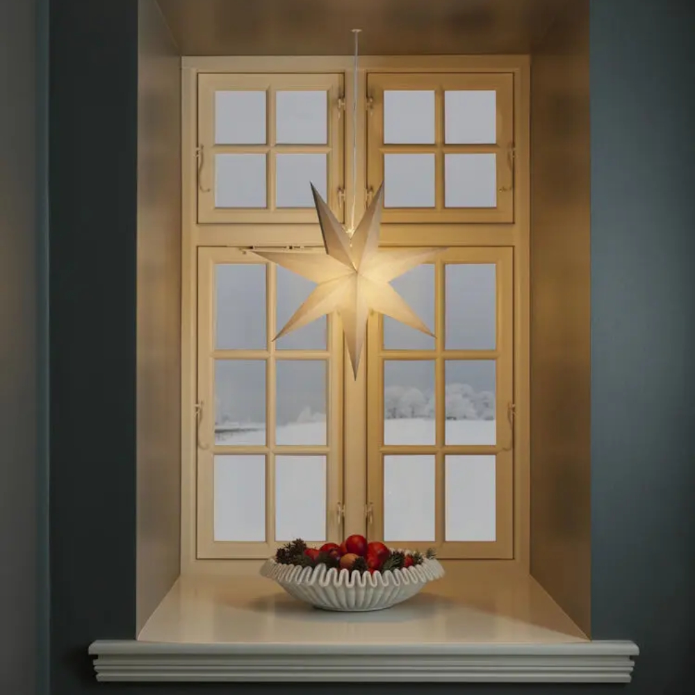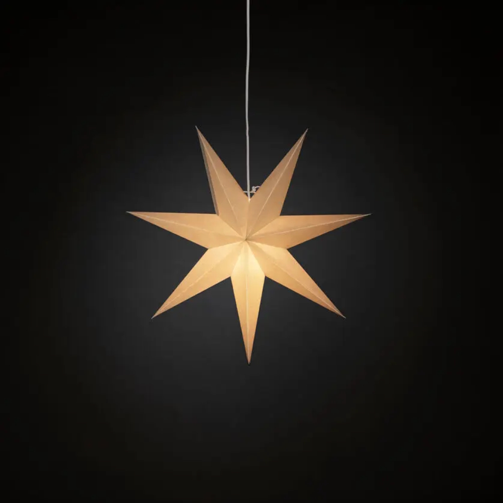 Hanging Advent star with 7 points. Cord stand with 5 meters of connecting cord included, E14 socket. Cord switch. Diameter 60cm.