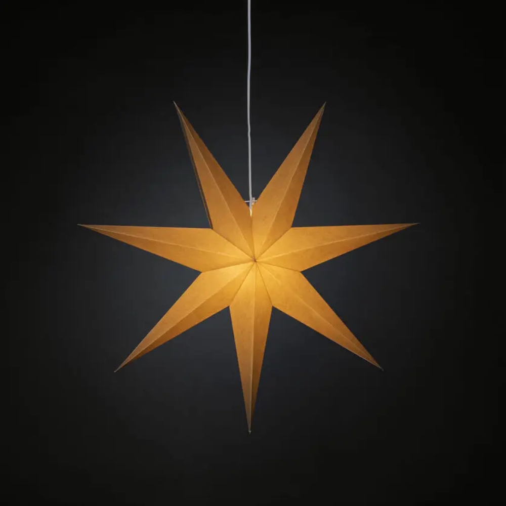 Hanging Advent Star with 7 points. Cord stand with 5 meters of connecting cord included, E14 socket. Cord switch. Diameter 78cm.