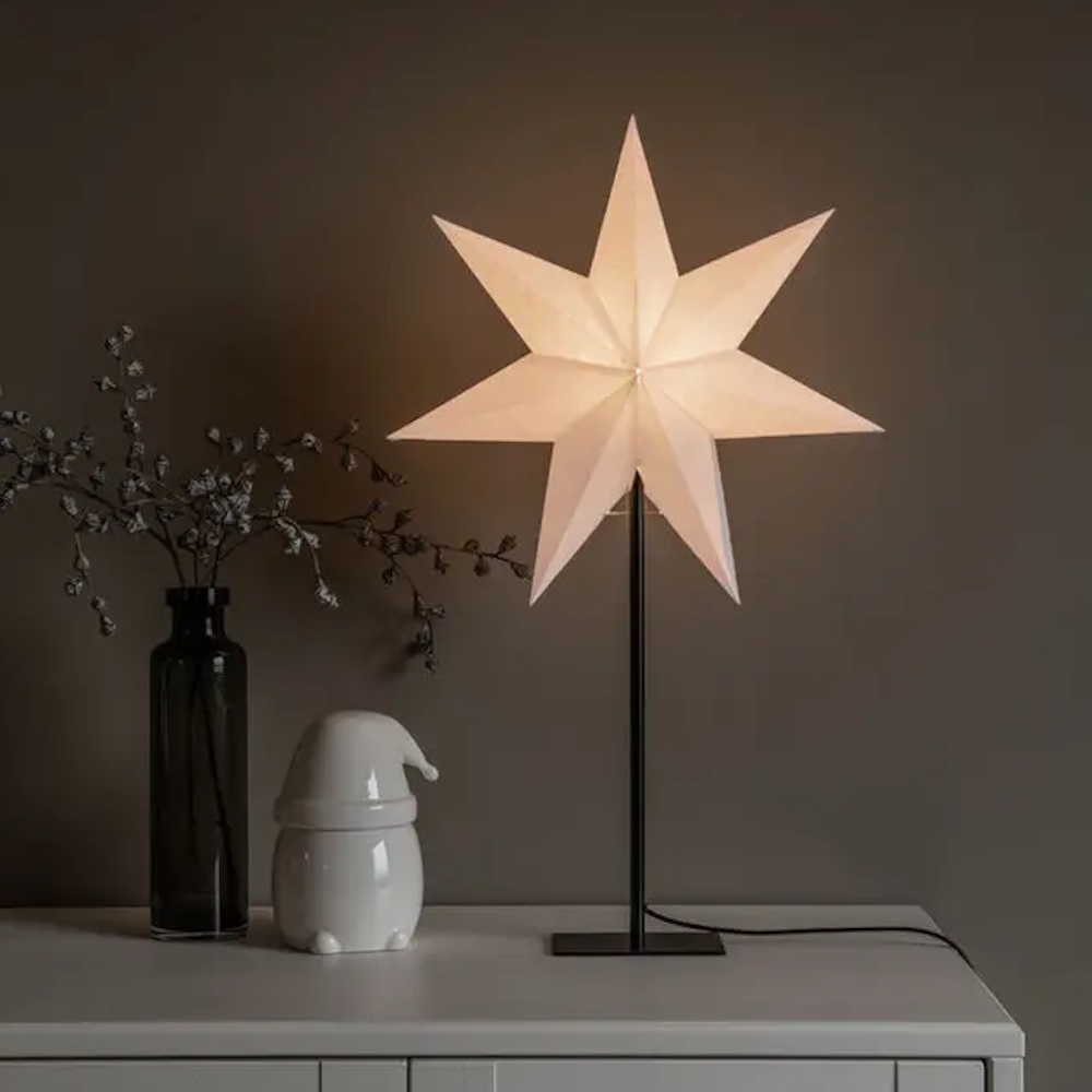 Advent star in white with 7 points on metal base. 2.4 meter connection cable with cord switch. E14 socket (light source not included).