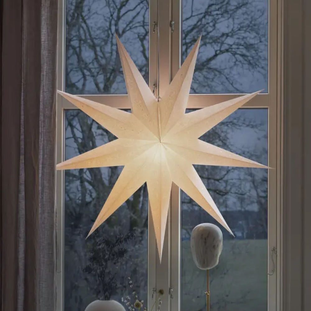 Paper Star White Pattern 115 cm is a 9-pointed paper star that is sold including a cord stand.
