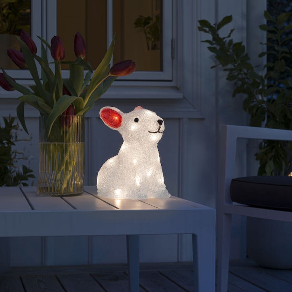 Cute rabbit that can spread its soft glow over the garden or balcony. Made of durable acrylic plastic and lights up with 24 warm white LED lights - perfect for both indoor and outdoor use. A fabulous decoration with a timer function of 6 hours and powered by 4xAA batteries (not included).