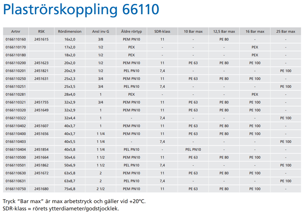Tryck och temperatur: Max arbetstryck: Respektive rörtyp avgör, se tabell nedan. Arbetstemperatur: Respektive rörtyp avgör, koppling max +95ºC.