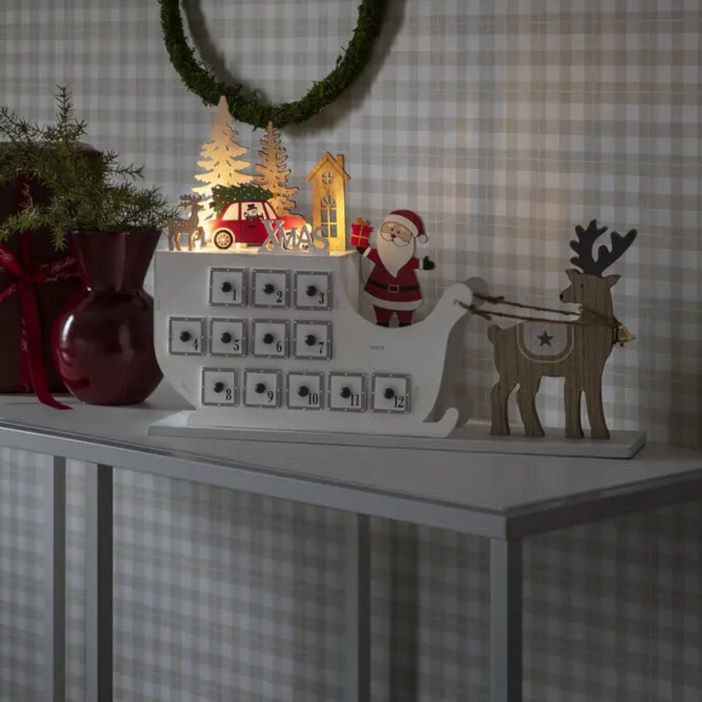 Charming Advent calendar with 24 small boxes, in the shape of a sleigh with Santa and reindeer. Made of wood and decorated with detailed silhouette figures and warm white LEDs, it spreads a cozy atmosphere. Equipped with a 6-hour timer and battery operation, for easy placement.