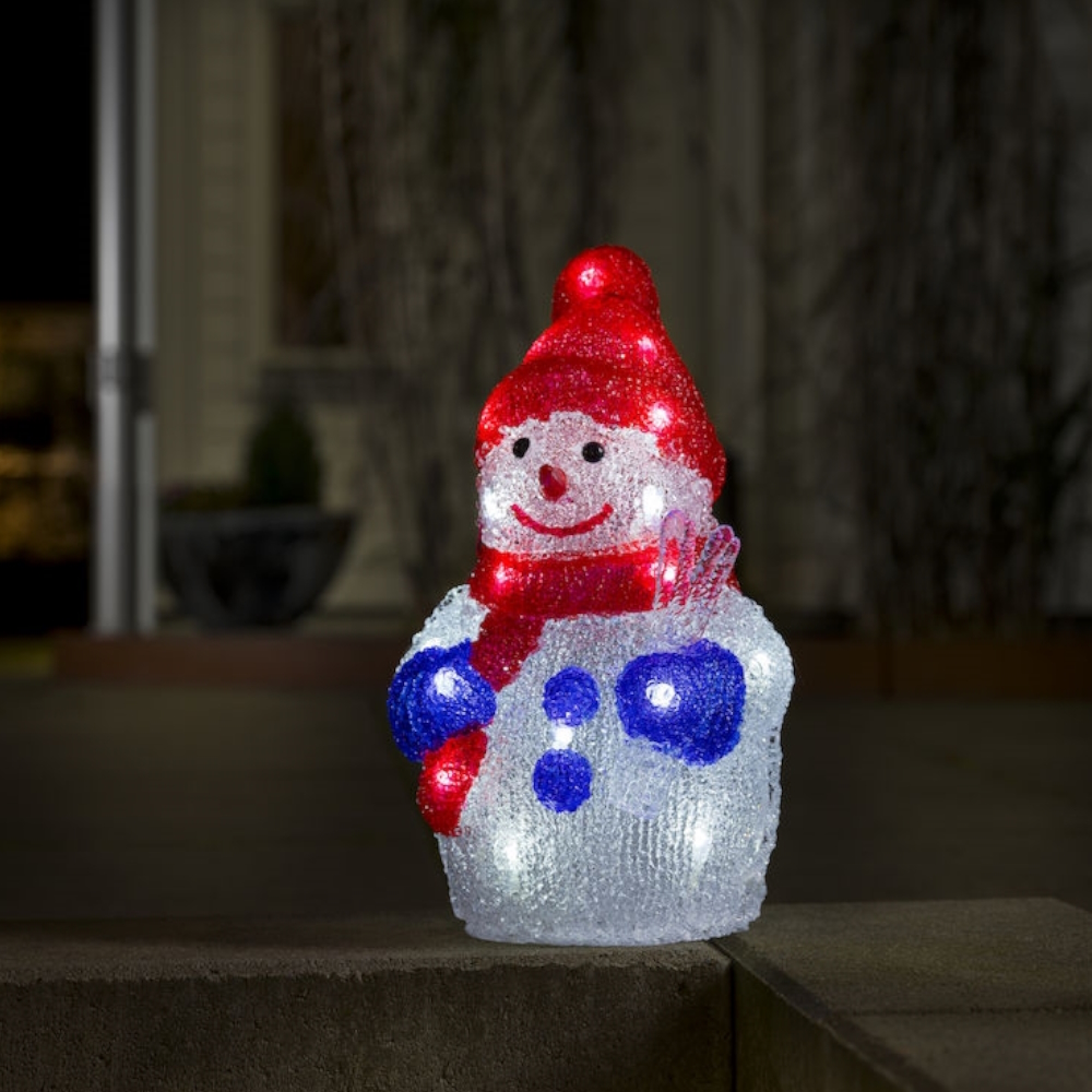 Snowman acrylic from Gnosjö Konstsmide with 24 white LED lights powered by 4 AA batteries. For outdoor use.