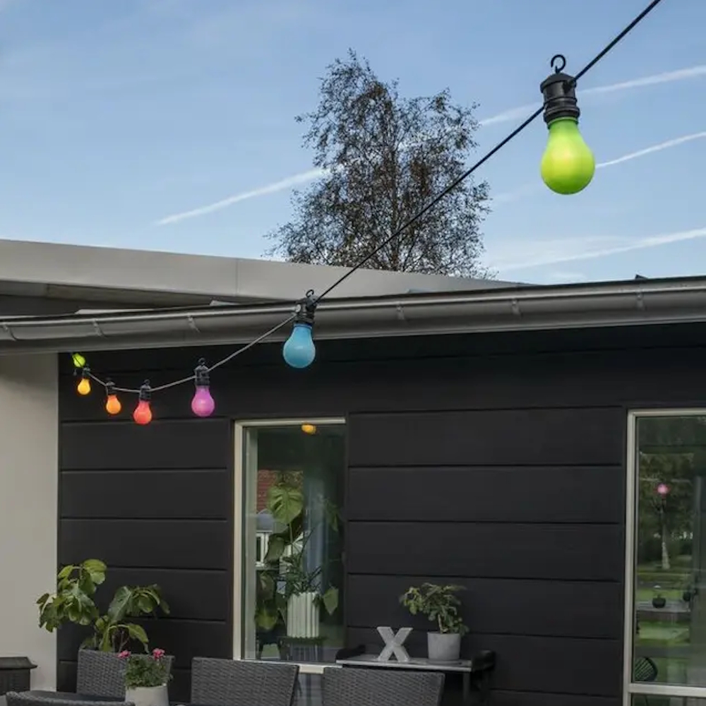Party string for the party area or balcony, with 10pcs pastel colored domes and replaceable LEDs. The light string has a built-in dimmer/timer and the lamp spacing is 50 centimeters. The connection cable is 10 meters, which gives a total length of 14.5 meters.