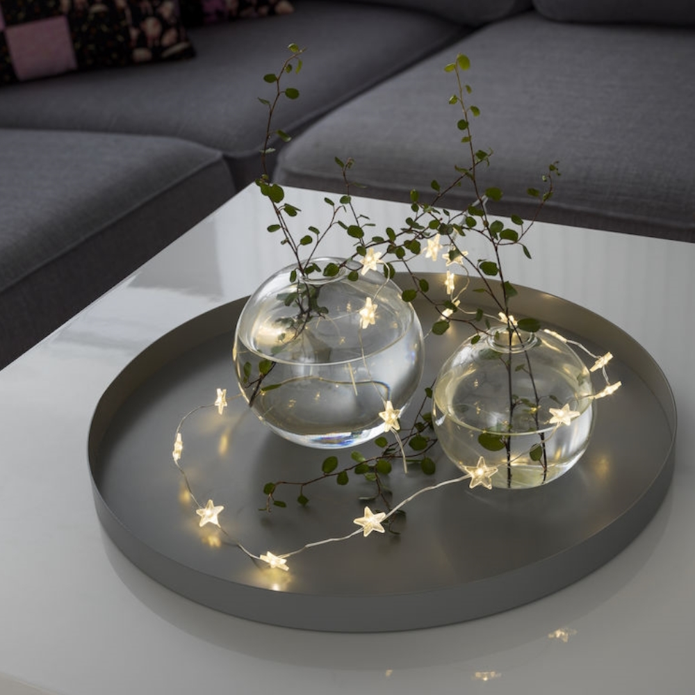 Strip lights from Gnosjö Konstsmide that have 20 stars with warm white LED lights in steady and flashing light. Powered by 3 AA batteries (not included!). The string is 1 m long with a connection cord of 0.3 m.
