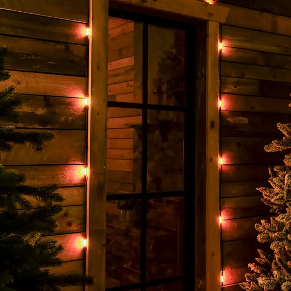String lights with 30 oblong amber-colored LEDs on 9.57m for outdoor use. Black cable. Powered by a 30V transformer. The connection cable is 1000cm.