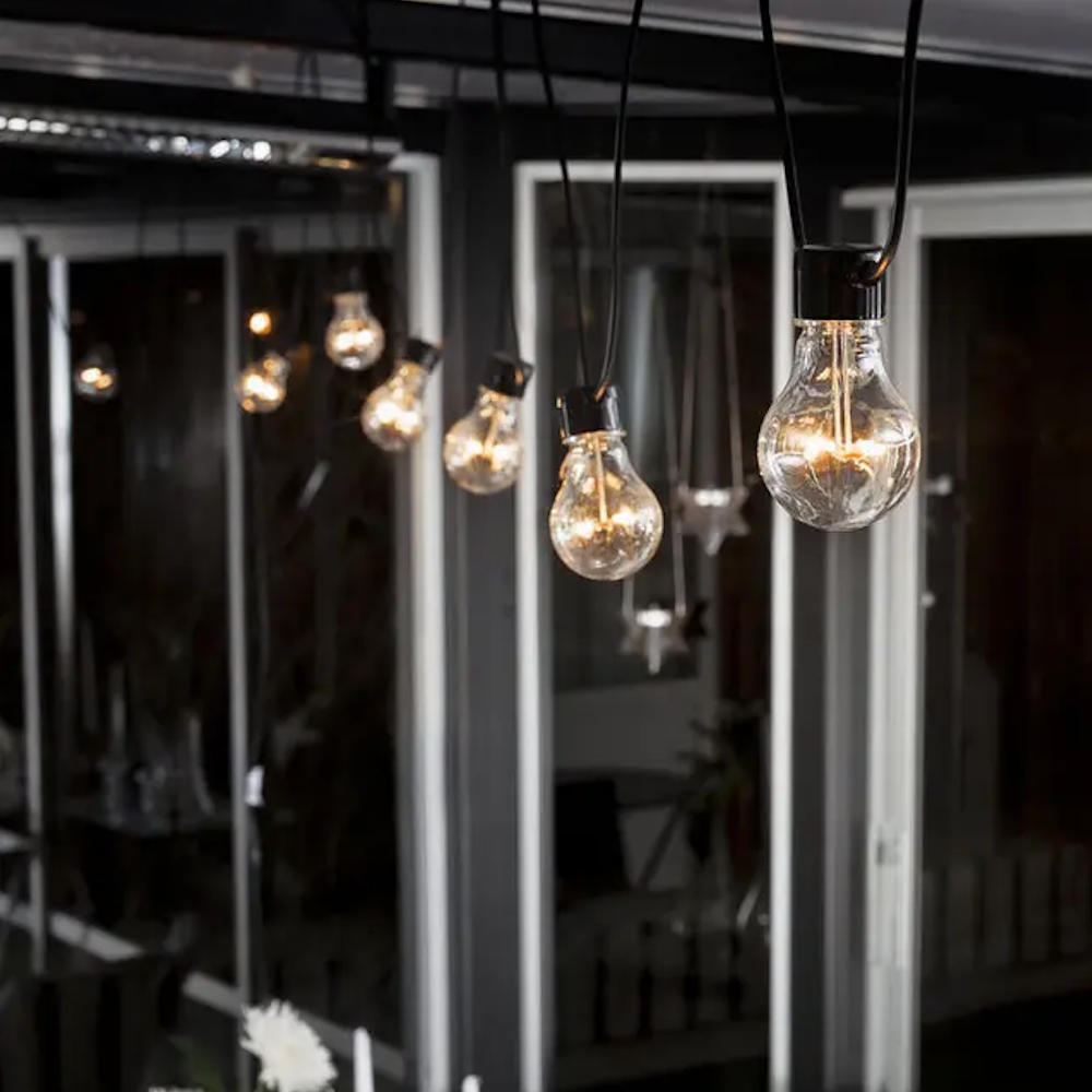 Party string starter set, for the patio or greenhouse. The string lights have 10 amber colored LEDs. The lamp spacing is 100 centimeters. The connection cable is 10.85 meters, which gives a total length of 20 meters. Build on with 10 more lamps with additional string 2397-800.