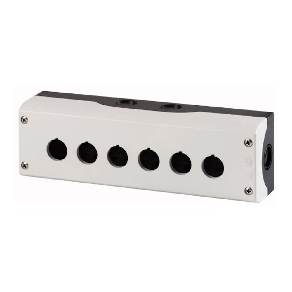 Surface mounting enclosure, Housing: Insulated material, With high-grade steel screws, Number of locations: 6, Cable entry: rear: 2 x M20, at top: 2 x M20, lateral: 2 x M20/M25 (1 x each side), Degree of Protection: IP66, Color RAL Value: RAL 7035, Color: Enclosure base anthracite, Connection to SmartWire-DT: no, For use with: (Illuminated) pushbuttons, (Illuminated) selector switches, Key-operated pushbuttons, Indicator light, controlled stop/emergency-stop buttons with yellow label.