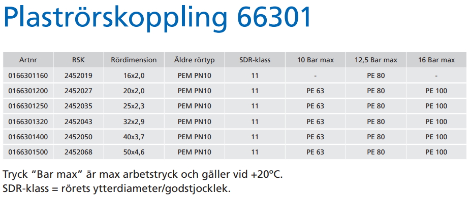 Tryck och temperatur: Max arbetstryck: Respektive rörtyp avgör, se tabell nedan. Arbetstemperatur: Respektive rörtyp avgör, koppling max +95ºC.