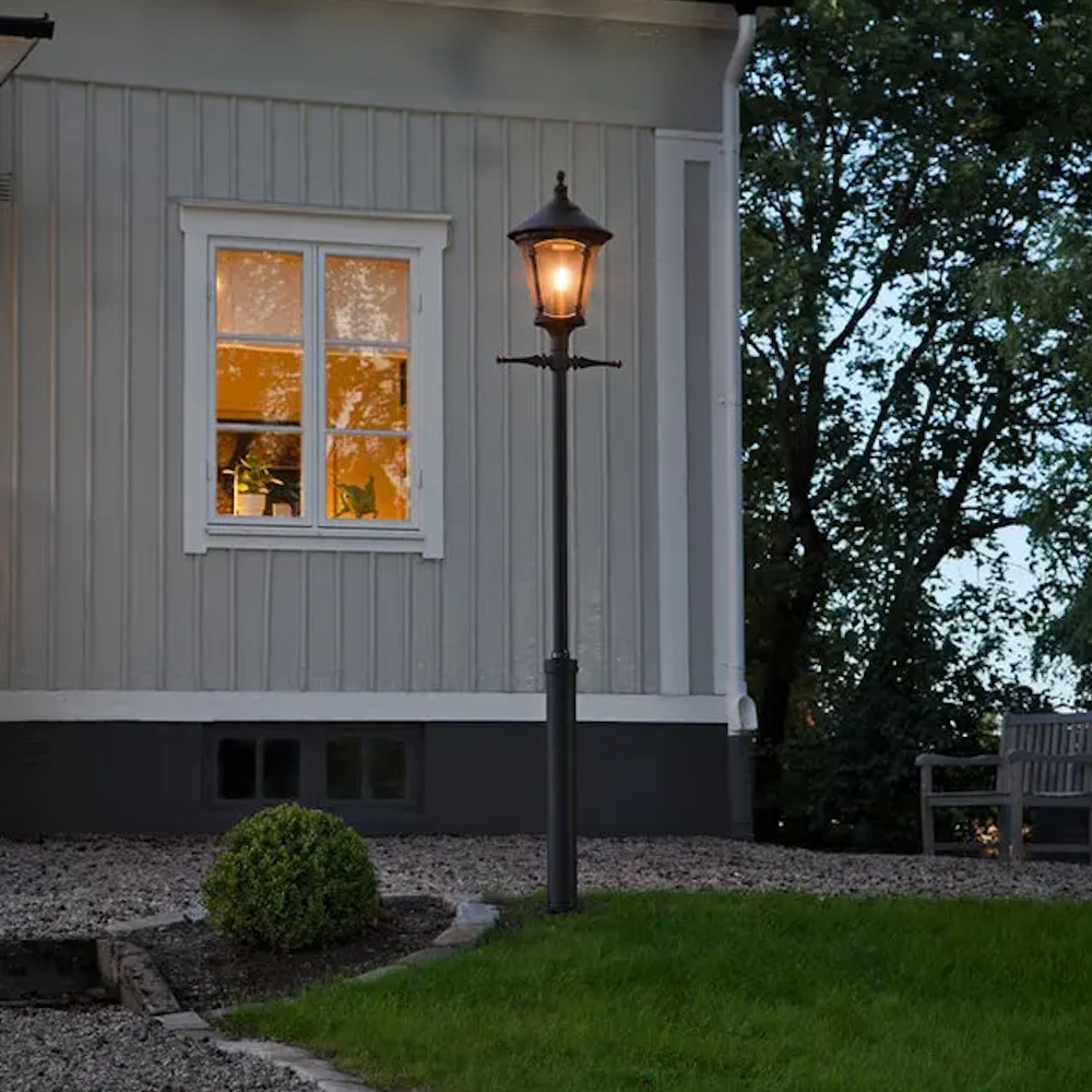Virgo post light 255cm in black lacquered aluminum with clear or smoked glass – a classic and durable outdoor lighting for garden, driveway or entrance. E27 socket, max 100W. Post included.