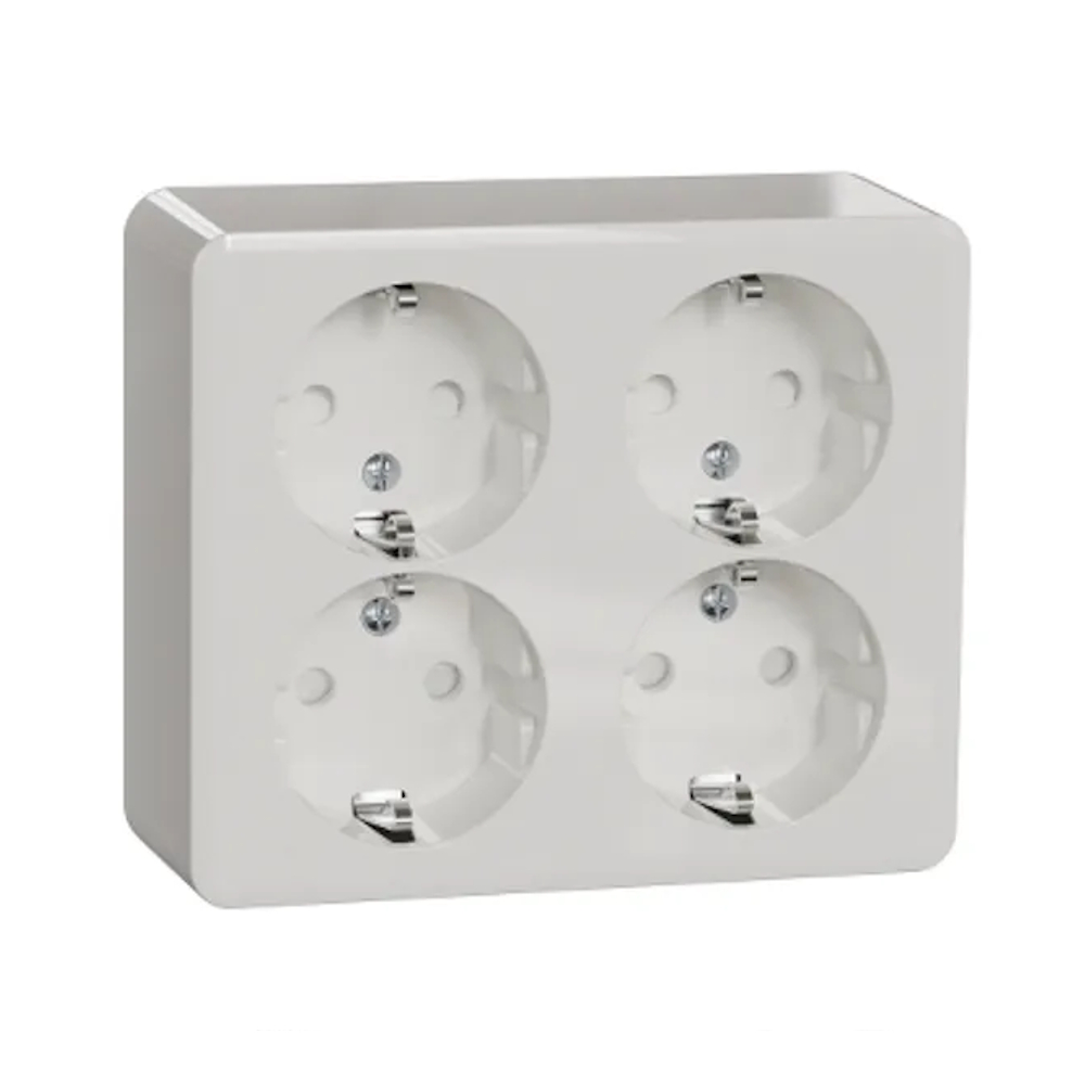 4-way wall socket for surface-mounted installation with integrated base plate. 16AX, 250V, earthed.