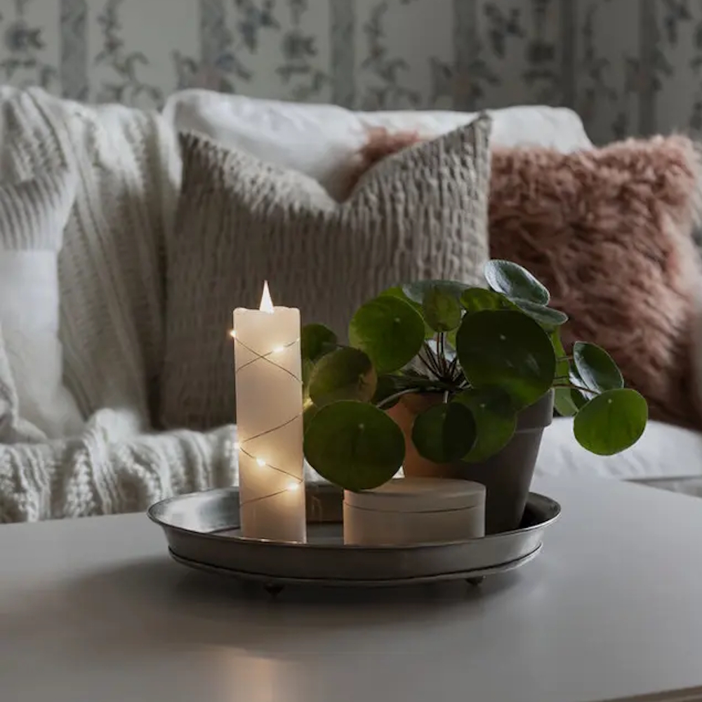 Wax candle in cream white color with amber colored micro LED strip and light, powered by 2xAA batteries, timer function of 4 or 8 hours.
