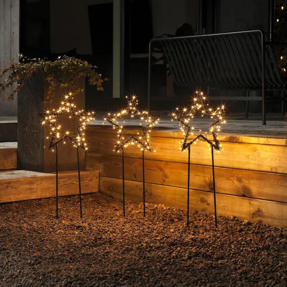 3 dekorativa stjärnor med amberfärgad LED. Skapa julkänsla i din trädgård. Svart anslutningskabel 10m. Inklusive transformator och markspjut.