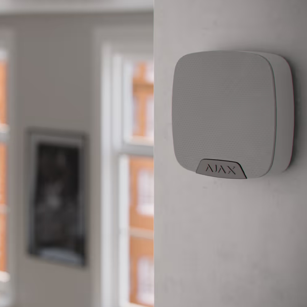 Trådlös siren för inomhusbruk som reagerar snabbt på larm från ditt Ajax-säkerhetssystem och avger ett kraftfullt ljud för att varna dig.