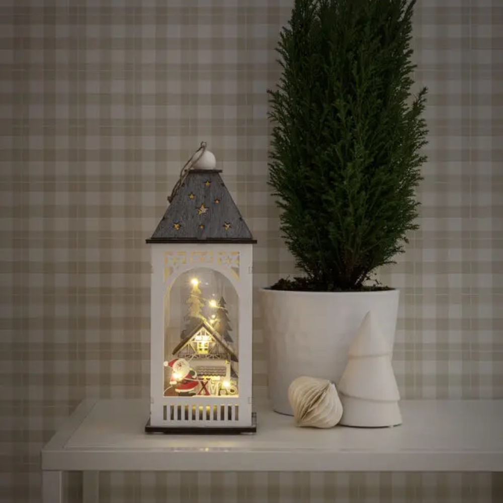 Charmig lanterna med detaljrika siluettfigurer och ordet Xmas som fångar känslan av vinter i miniatyr. Utrustad med 6‑timmars timer och batteridrift, för enkel placering.
