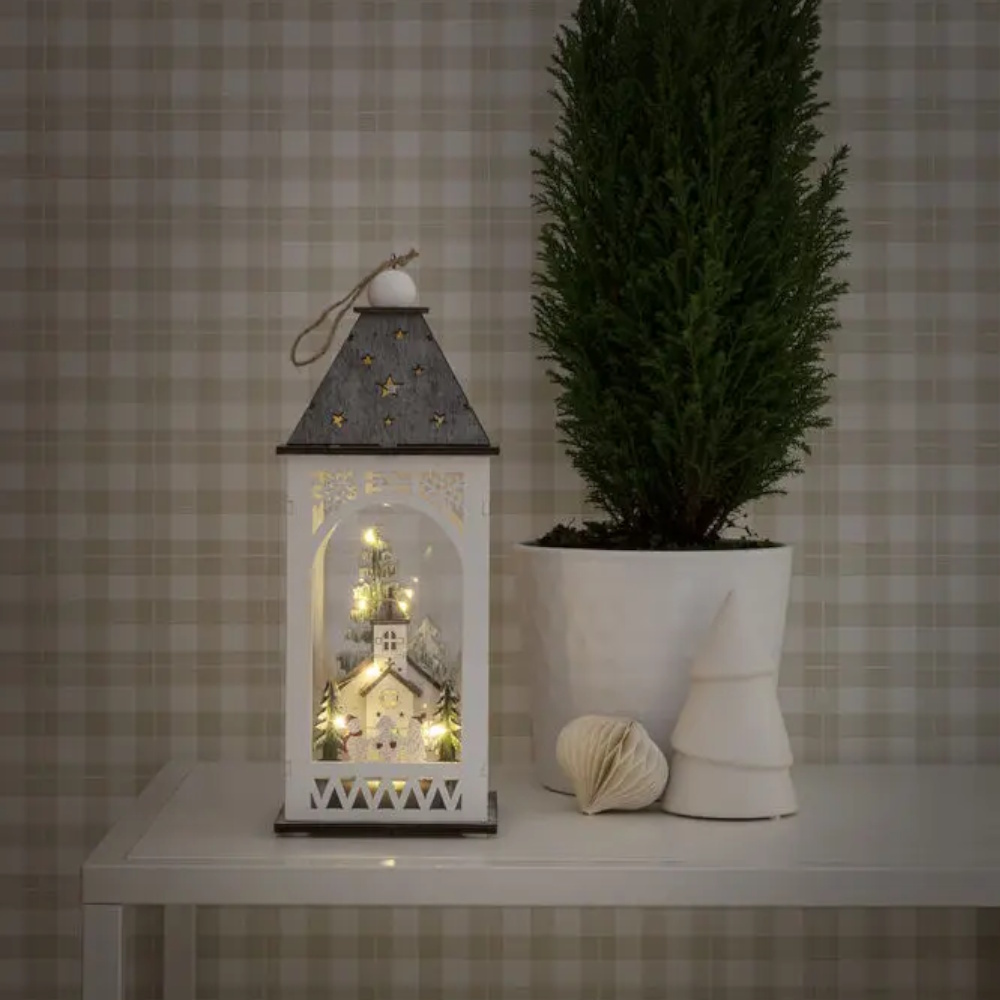 Charmig lanterna med kyrka och detaljrika siluettfigurer som fångar känslan av vinter i miniatyr. Utrustad med 6‑timmars timer och batteridrift, för enkel placering.