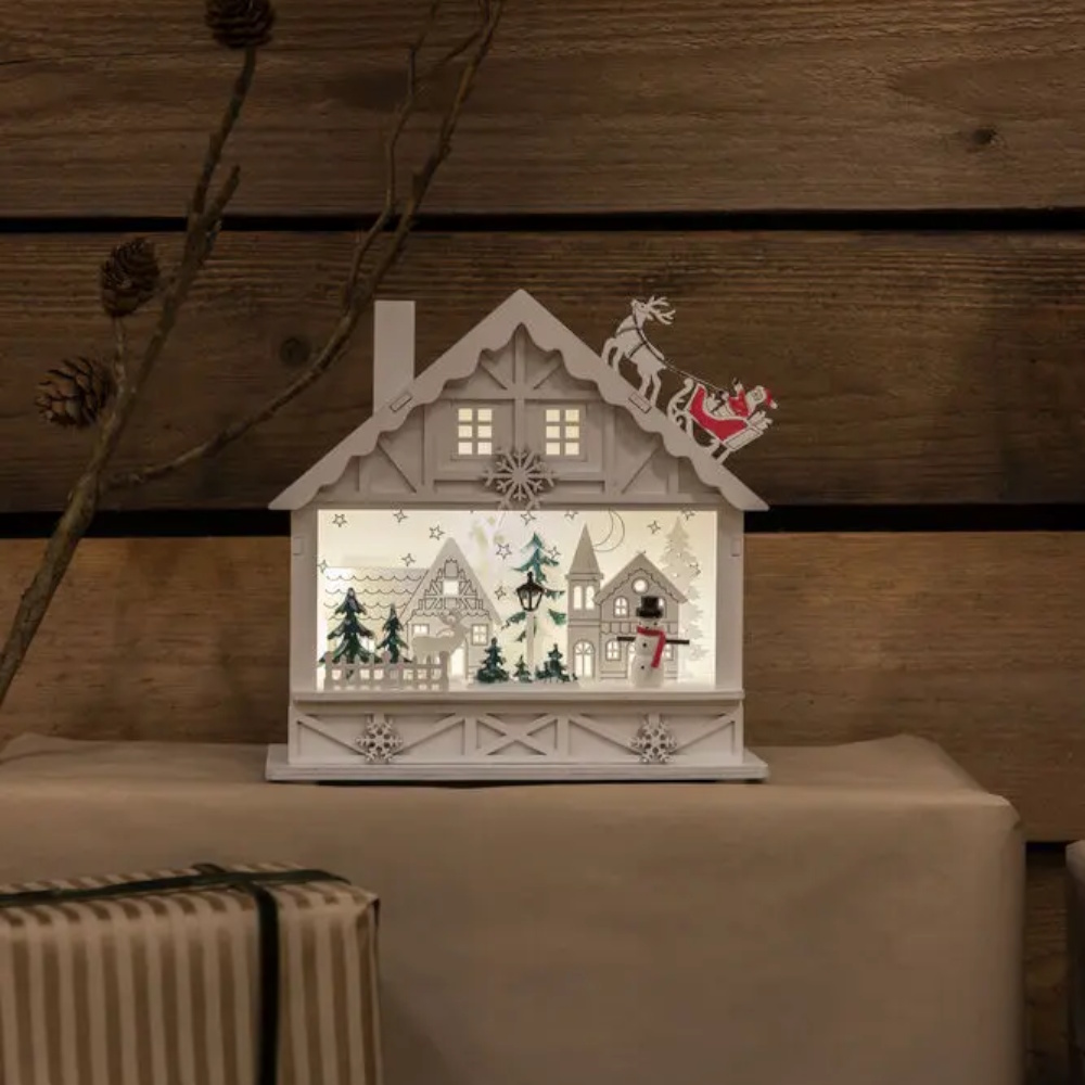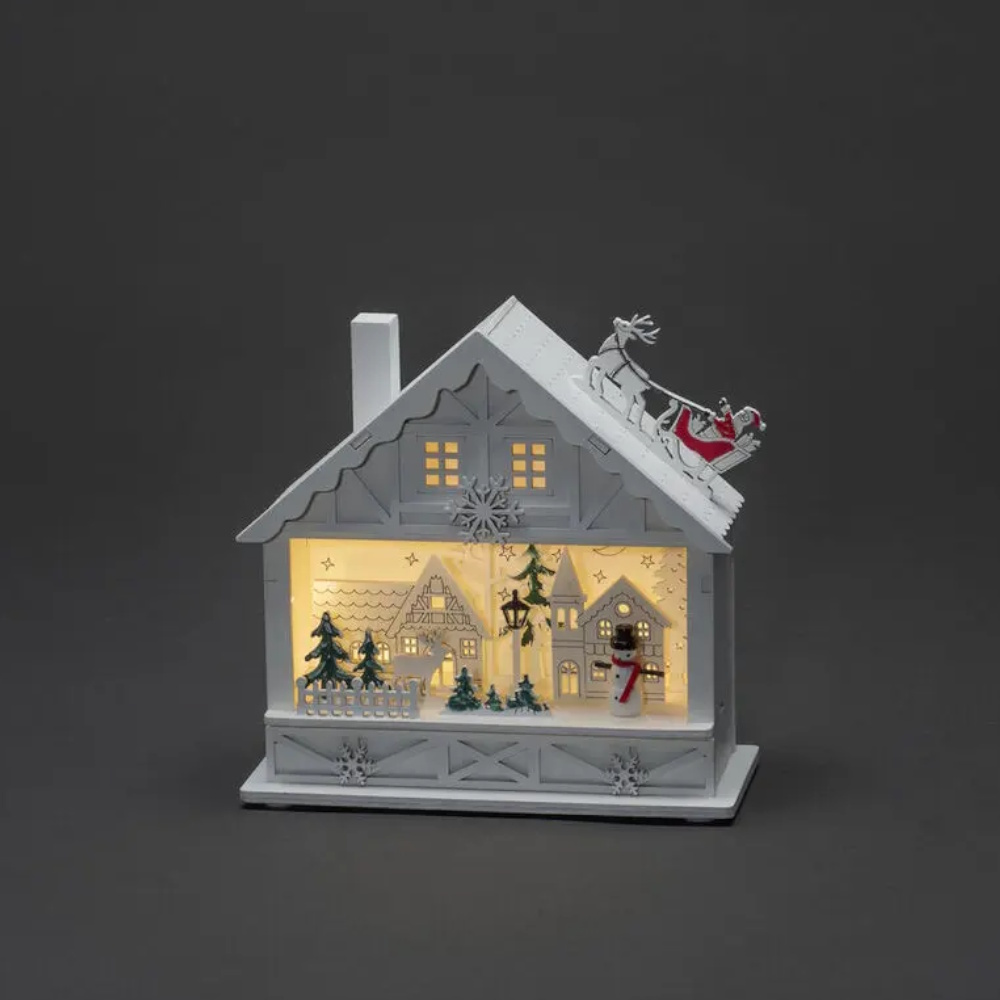 Liten julby med tomtens släde på taket och snögubbe bland husen. Tillverkad i trä med detaljrika siluettfigurer och 4 varmvita LED. Utrustad med 6‑timmars timer och batteridrift, så att du enkelt kan placera den där den sprider mest julstämning.
