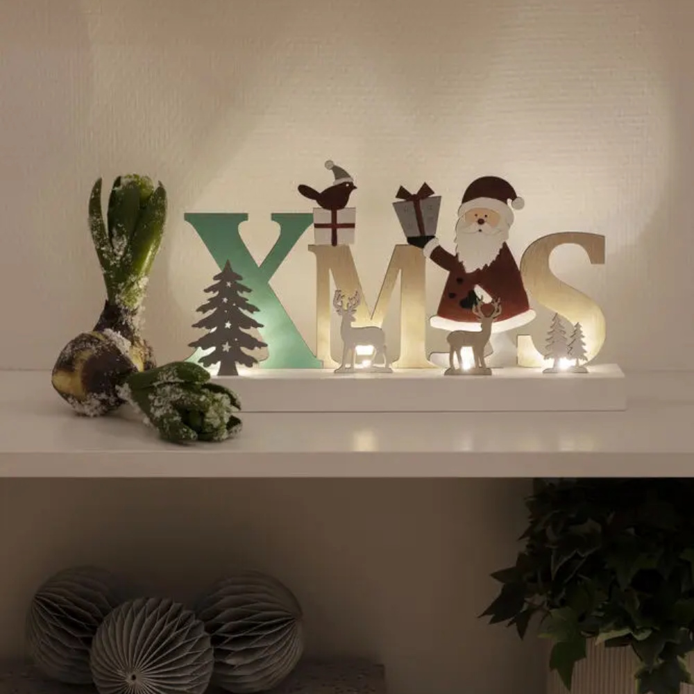 Charmig juldekoration med texten XMAS, tillverkad i trä och 4 varmvita LED, utrustad med 6‑timmars timer och batteridrift.