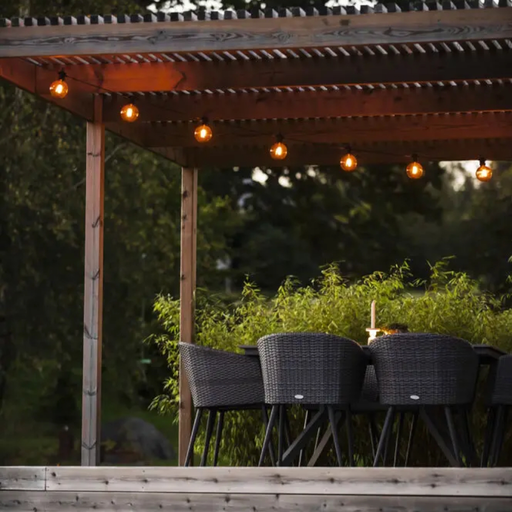 Partyslinga inklusive batterilåda med solpanel, perfekt där det saknas eluttag, 10st rökfärdade kupor och varmvita utbytbara LED.