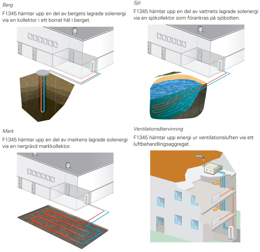 F1345 är en flexibel produkt med avancerad styrutrustning och är anpassningsbar till ett flertal systemlösningar. Som värmekällor kan bland annat berg, mark eller sjö användas. Även grundvatten kan användas som värmekälla, vilket dock kräver en mellanliggande värmeväxlare. Ett annat användningsområde kan även vara ventilationsåtervinning i flerfamiljsbostäder. F1345 kan styra upp till åtta olika klimatsystem (kräver tillbehör), t ex för en lägre framledningstemperatur i golvvärmeslingor än i radiatorer.