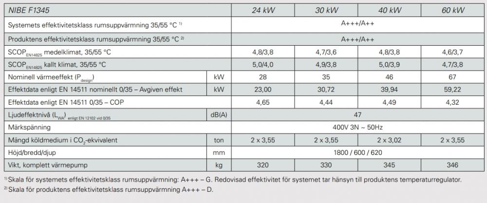 NIBE F1345 är en kraftfull och flexibel bergvärmepump som finns i effektstorlekarna 24, 30, 40 och 60 kW. Energiklass A2+
